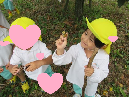 まだ落ちたばかりで緑色のどんぐりに気づくうさぎ組さん🐰