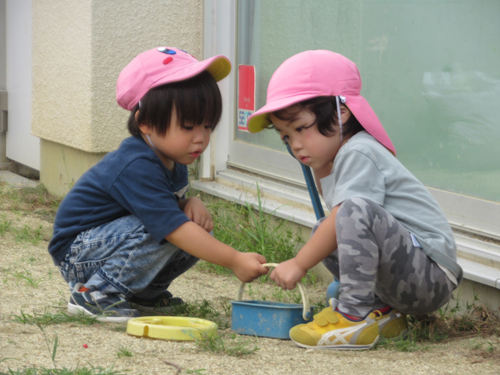 そのあとは砂場に行って昨日みんなで集めた木の実やはっぱを使って遊びました