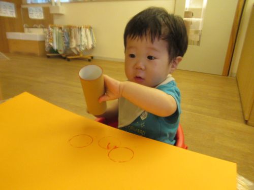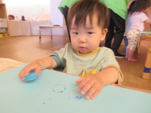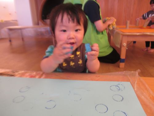 おててが絵の具いっぱいになりながら紙や手に絵の具が付く様子を楽しみました😄💛💜