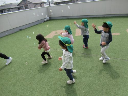 シャボン玉もとばしてみると、風に吹かれてふわぁ~ととんでいき、一生懸命じーっと見つめて目で追っている姿もありましたよ😄