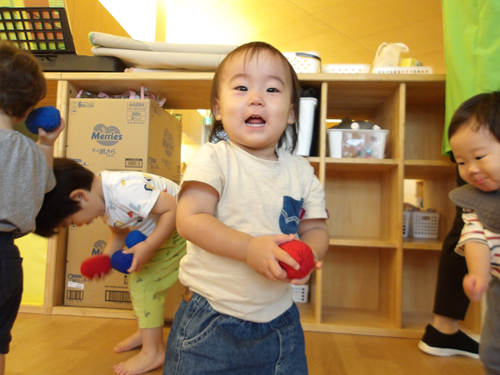 ちょっと投げてみたり、思い切りなげてみたり、飛ばしてみたり、転がしてみたり… 玉の性質を触って感じながら、あそんでいく子どもの姿がありました⭐