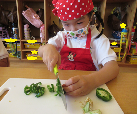 「私1人で包丁使えるよ」と挑戦してみました‼包丁の持ち方も完璧です![]()