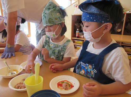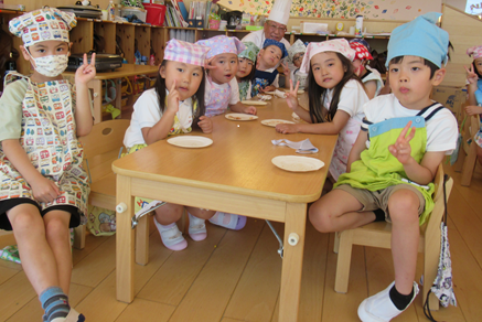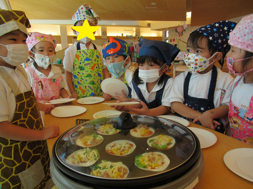 「チーズが溶けていっている~」「餃子の皮の色もかわったよ」と発見したことをお友だちと言い合っていましたよ