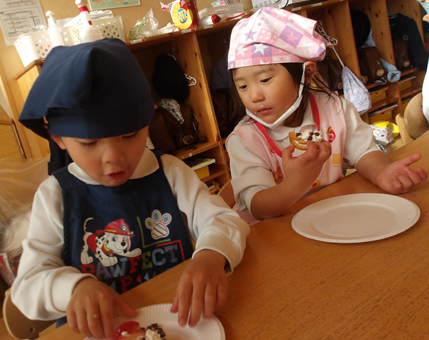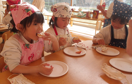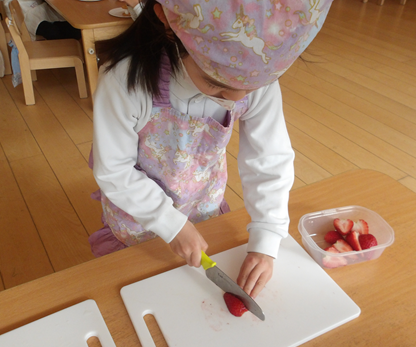 まずはいちごのヘタを取って、お兄さんお姉さんが包丁で切ってくれましたよ🤗