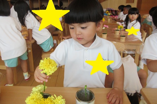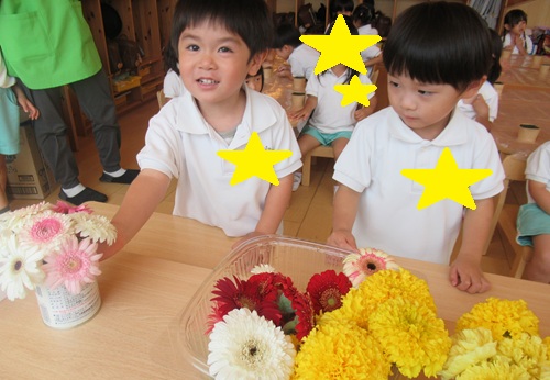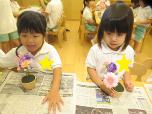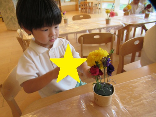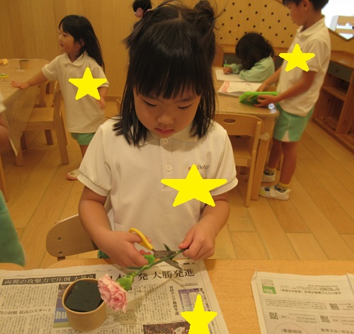 きりん組さんは、好きな長さに切ってオアシスにさしていきます✂