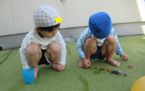 恐竜のおもちゃを集めてお友だちとキレイに並べてお話をしていましたよ