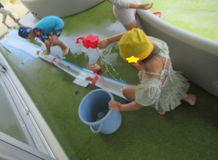 小さなウォータースライダーで玩具や水を流して遊んでいるお友だちもいました✨