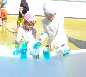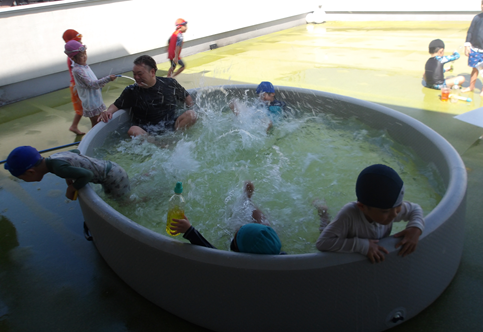 お父さん先生とも水鉄砲で掛け合いっこやバタ足競争でみんな負けずに遊んでいましたよ![]()