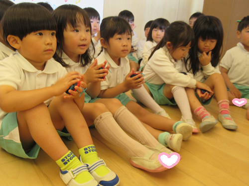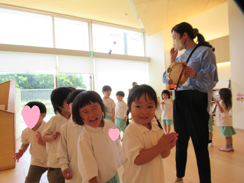 きりん組さんは、「おつかいありさん」の曲に合わせてすず、タンバリン、トライアングルで合奏をしました♫
