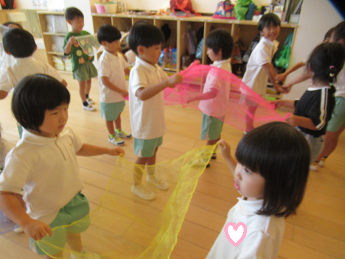 ぱんだ組さんはお友だちとペアになり協力してひらひらと海を表現しましたよ♪