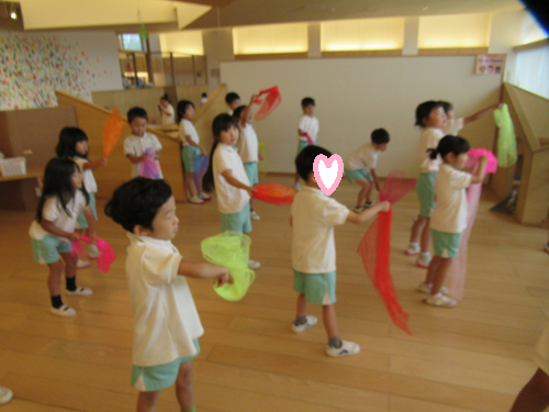 今日から7月のお歌。「うみ」をテーマにしてスカーフなどで音に合わせて波などを表現しました✨