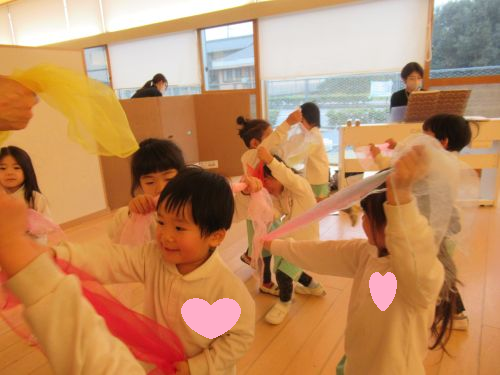 ぱんだ組さんもカラフルスカーフを使ってお友だちとスカーフ遊びもしましたよ😄✨