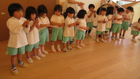 少しずつカスタネットを自分たちでつけられるようになり、「赤が下だよね!」と先生と確認していましたよ![]()