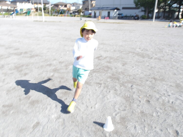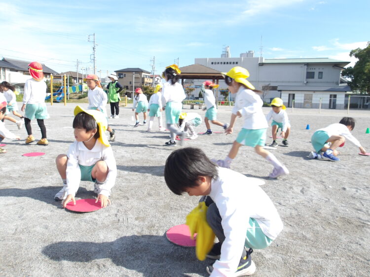 うさぎ組さんは園庭でかけっこやダンス、オオカミごっこで身体を動かした後