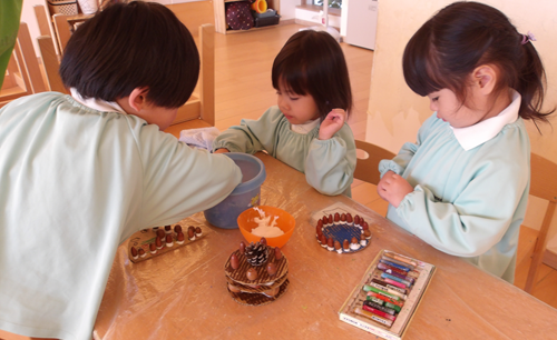 公園で拾ってきたどんぐりや松ぼっくるをボンドでつけて…完成するのが楽しみですね![]()