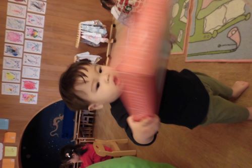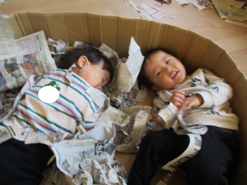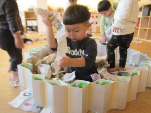 他にも先生に手作り帽子を作ってもらい嬉しそうに身に付けたり、牛乳パックに詰め込んだりして遊ぶ姿がありました😄