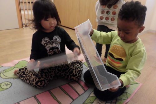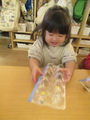 子どもたちに好きな色を教えてもらい入れてもらいうと、仲良くお互いのを見合って転がして遊んでいました
