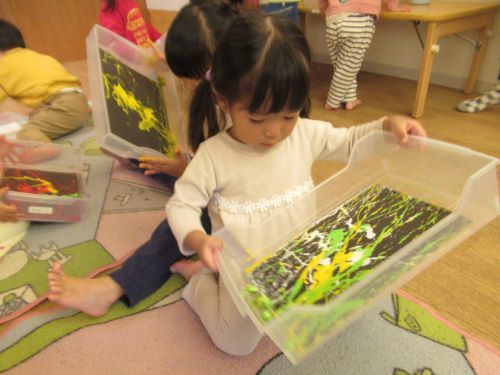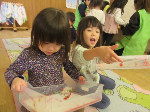 ひよこ組のお友だちは誤飲にも注意しながら見守っていましたが、先生と周りのお友だちの遊び方を真似てポットン落としを集中してやっていたり順番に絵の具コロコロ遊びにも参加していましたよ