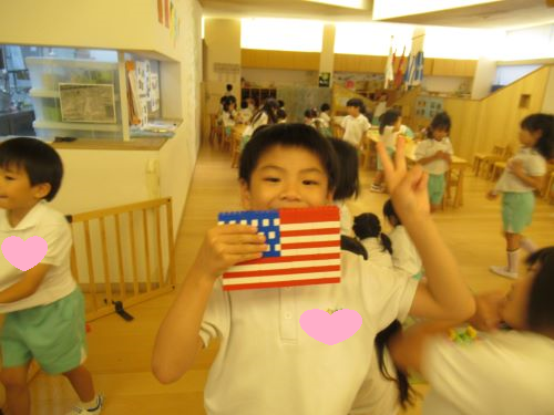 自由遊びの時間にはこんな国旗をつくってみたよ~!!と色々な国の国旗をブロックで作って見せてくれるお友だちもいましたよ✨✨