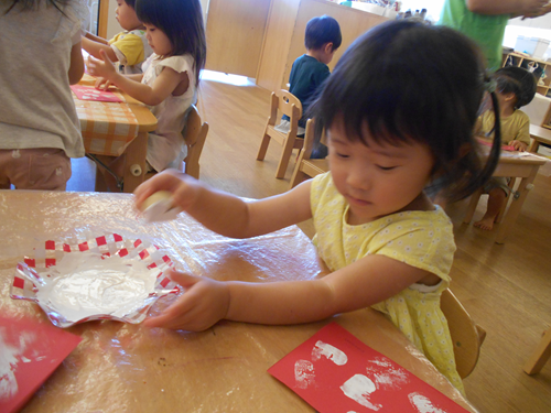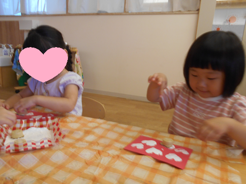 おともだちと譲り合ってスタンプに絵の具をつけていましたよ💖