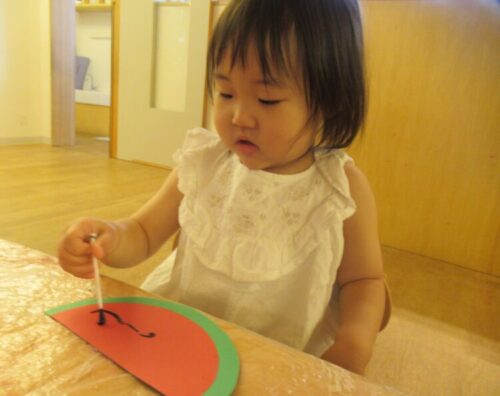スイカの製作では、綿棒をつかって種を表現してみました🍉