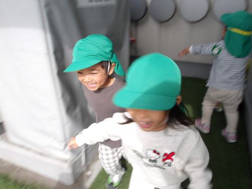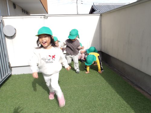 オオカミごっこをしたい!!というみんなの要望で、先生がおおかみになりきると、先生に見つかったー!!😆ととびっきりの笑顔を見せてにげていくみんなです🤭💖