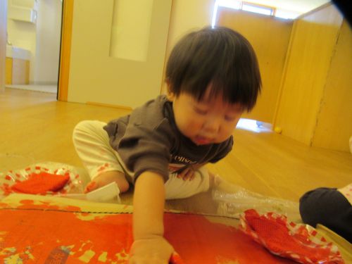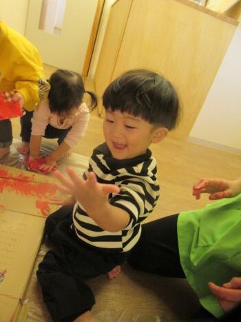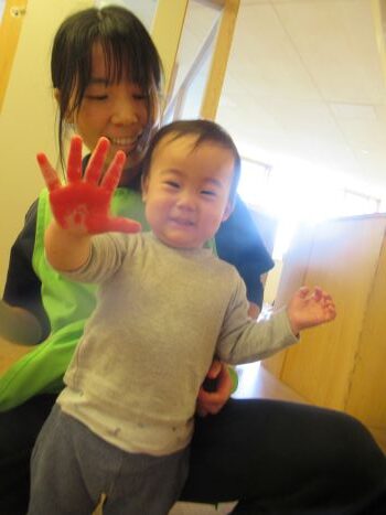 絵具遊びではおててを真っ赤にさせながらペタペタと思いっきり絵の具をつけて楽しみました🤭💖