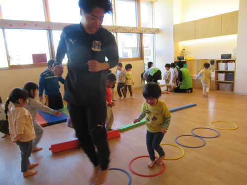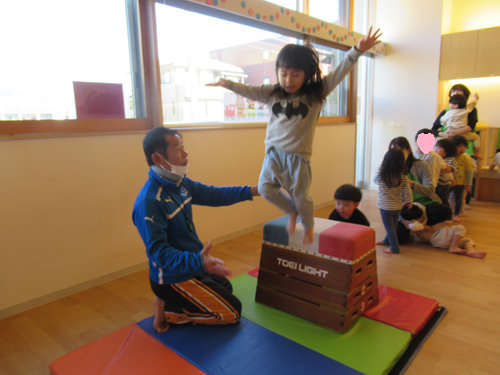 はじめは講師と手を繋いでいたおともだちも、繰り返すうちに1人で跳べるようになっていました👏