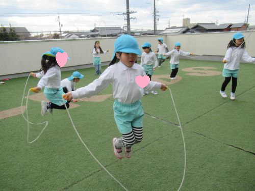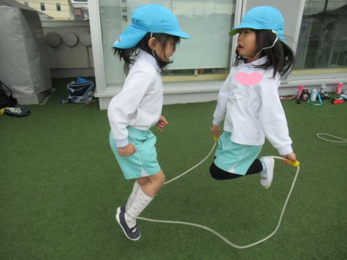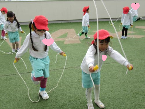 きりんぐみさんはおともだちと仲良く一つの縄跳びを一緒に跳んで協力していましたよ🌟