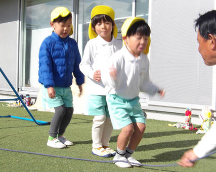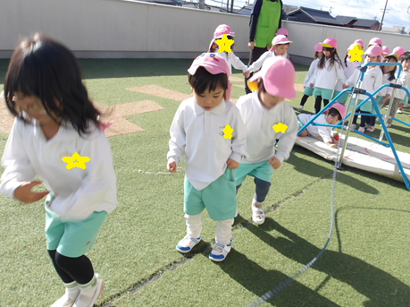 うさぎ組さんも大縄跳びに挑戦。まずは、大縄跳びをするときのリズムを確認していざ!