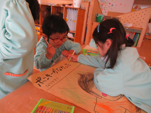 話したことを実行するために画用紙やマーカーを準備してクイズを作りました