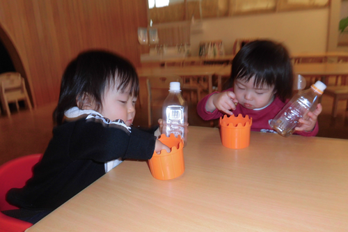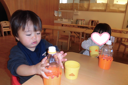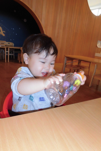 ひっくり返して 中に入れたものがどんなふうに動くのかに見入っていました。