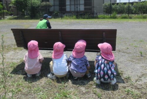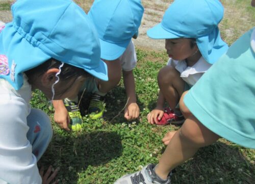 植物に紛れているバッタをすぐに見つけて捕まえているきりん組さん。