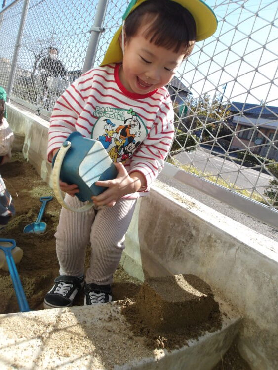 バケツの型抜き遊びをしていたこちらのあひる組さんは、上手にバケツに砂を敷き詰めて、きれいな四角い形の砂ができてこの笑顔です😊💗