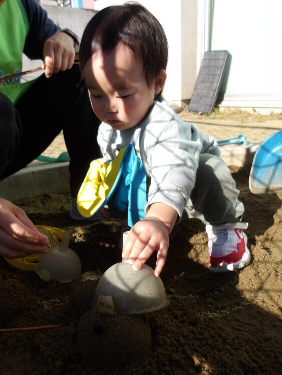 リナ先生が砂でスノーマンを作っていると、おもちゃを使って一緒に作るお手伝いです⛄🌟夢中で遊んでいましたよ😊