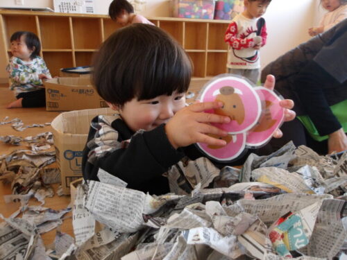 室内は新聞紙遊び😄 新聞紙の中に何が隠れているかな?