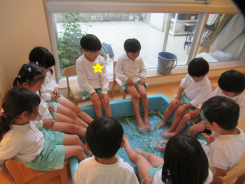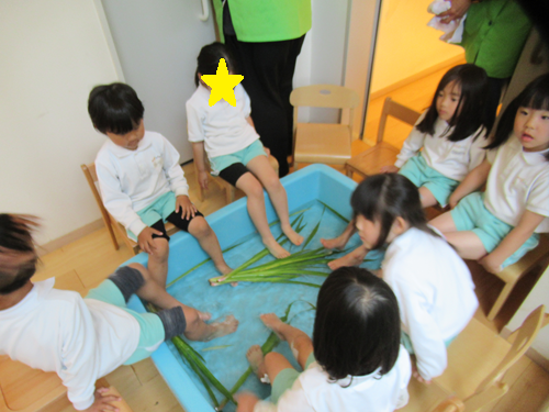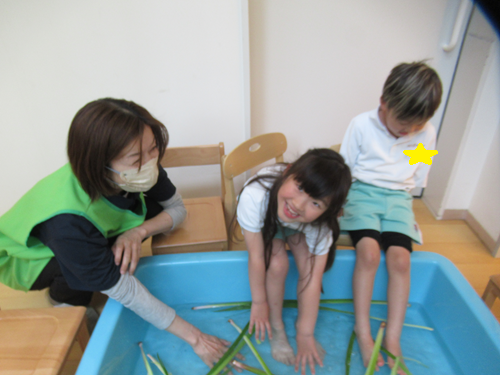 大きなタライに菖蒲の葉を入れ【菖蒲足湯】をしました![]()
