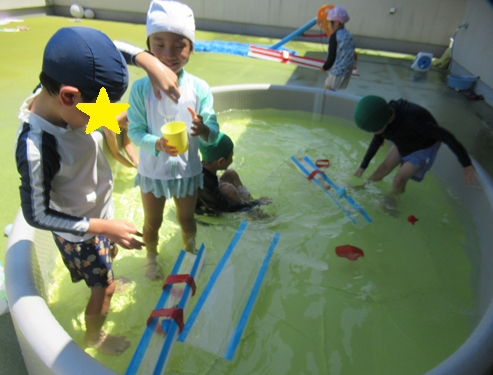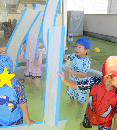 「水がかからないよ~すごくない」お友だちに水をかけられても安心だね