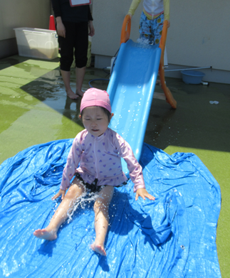 ウォータースライダーを目の前に子どもたちは目をキラキラさせながら楽しみにしていました✨✨「僕、すごい滑るんだよ~!」