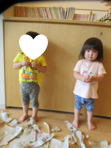 お友だちと一緒に並んで、新聞紙を小さく小さくちぎって楽しんでいました☺