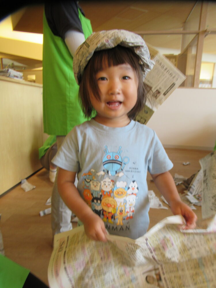 新聞紙で冠やブレスレットを作ってもらい、嬉しそうにいろんな先生に見せに行っていたお友だち🥰とっても可愛いです💕