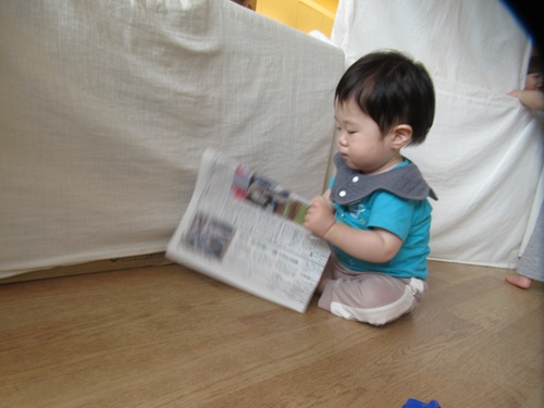 ひよこ組さんも「これなんだろう?」と興味津々。新聞紙を手に取りじっくりと紙の感触を味わっていました🤗
