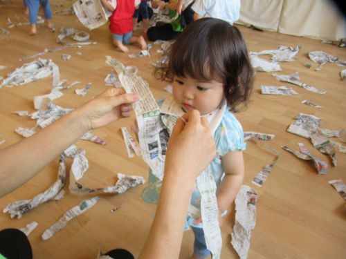 新聞紙に切れ目を入れて渡すと、小さなお友だちも両手でビリビリっと破くのが楽しくて何度も行っていましたよ🌟