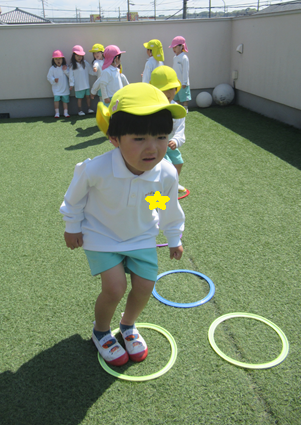 けんけんぱフープを最後まで跳ぶことができると、保育者に目をキラキラさせながら「できたよ!」と教えてくれましたよ✨