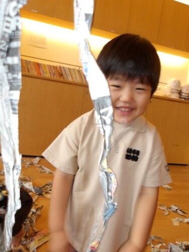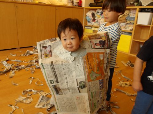 新聞紙を使ってオバケに変身👻しているお友だちを発見👀✨