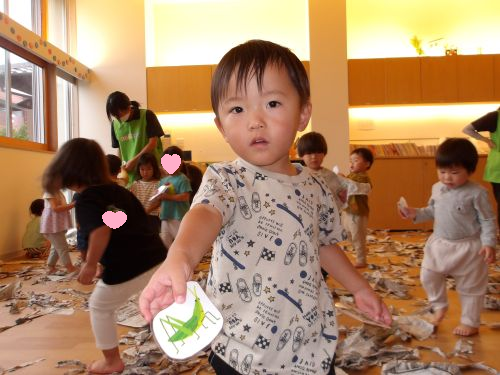 新聞紙遊びの最後には虫や果物を新聞紙の中から探し出して虫探検隊になっていました🔍🐞✨