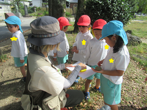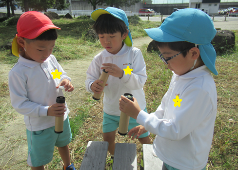 葉っぱや花、実を集めて、万華鏡に入れると、不思議な模様がくるくると変化し、「え!すごい」「いろいろな模様がでてくる!」と感動していました![]()