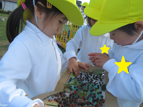 うさぎぐみのおともだちは葉っぱや木の実をたくさん拾ってきてダンボールシールにたくさんペタペタ貼りまっした🍃