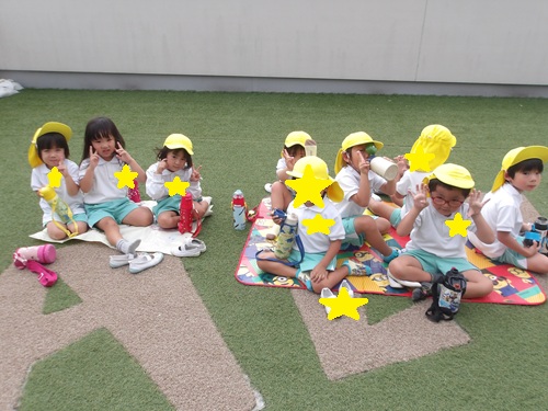 屋上園庭でピクニックごっこをしながら、お茶休憩をしているぱんだ組さん🐼