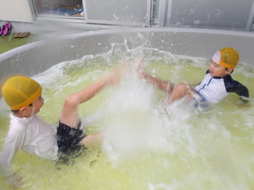 水鉄砲を交代しながら順番に遊んでいたり、バタ足やわにさん歩きを一緒にしていたり🎶